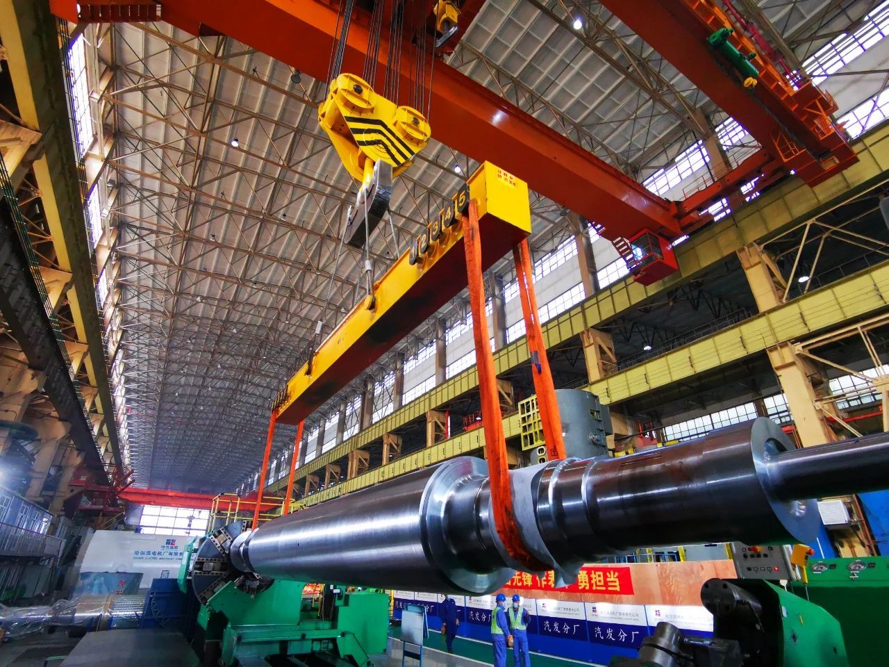 电机公司操作职员正在对内蒙古上海庙2号汽轮发电机转轴举行加工。。。。。。