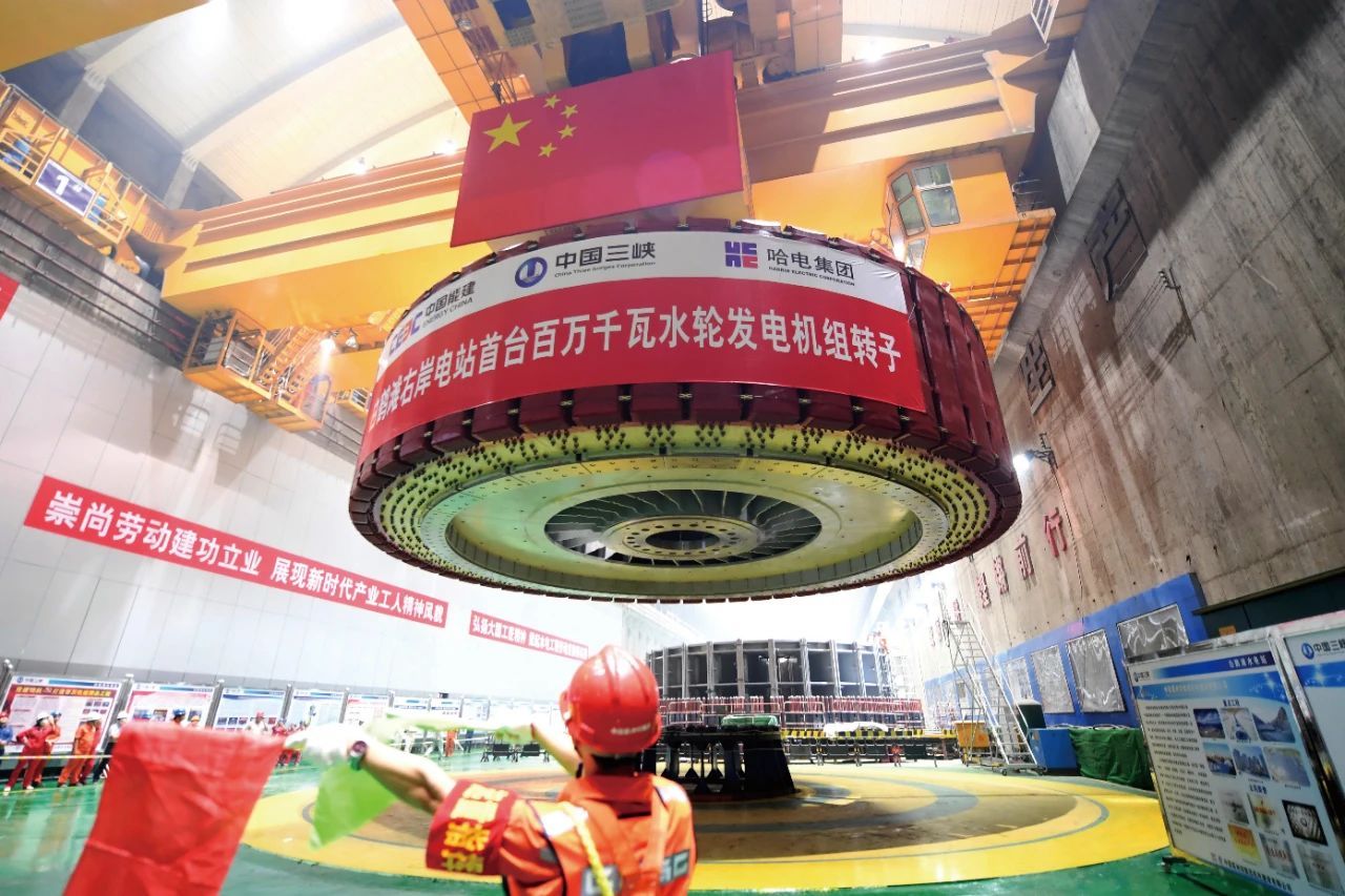 2020年9月9日,,,,,,电机公司研制的白鹤滩右岸电站首台全球单机容量最大功率百万千瓦水轮发电机组转子吊装乐成。。。。。。